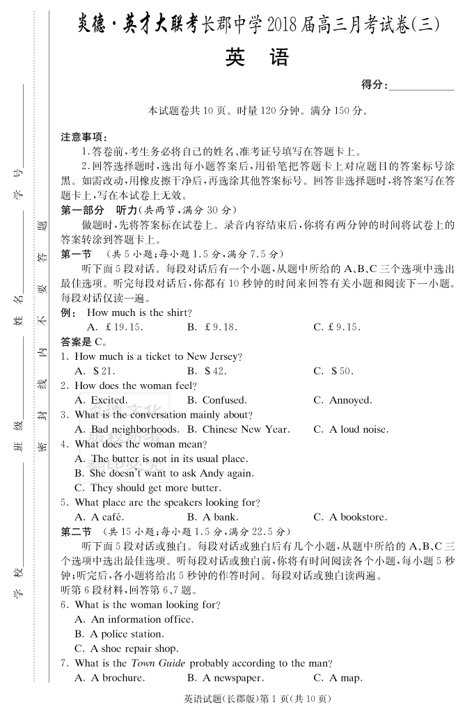 【英語】炎德英才大聯考2018長郡中學高三3次月考