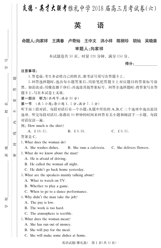 【英語】炎德英才大聯(lián)考2018雅禮中學(xué)高三6次月考