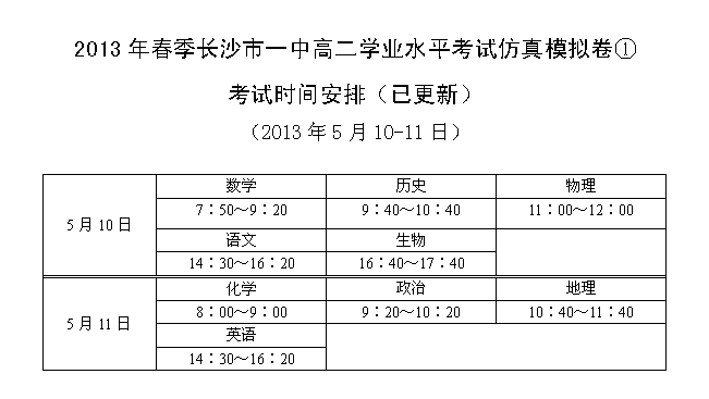 下一篇:2013年春季長沙市一中高二學(xué)業(yè)水平考試仿真模擬卷②考試時間安排(2013.05.31-06.02)