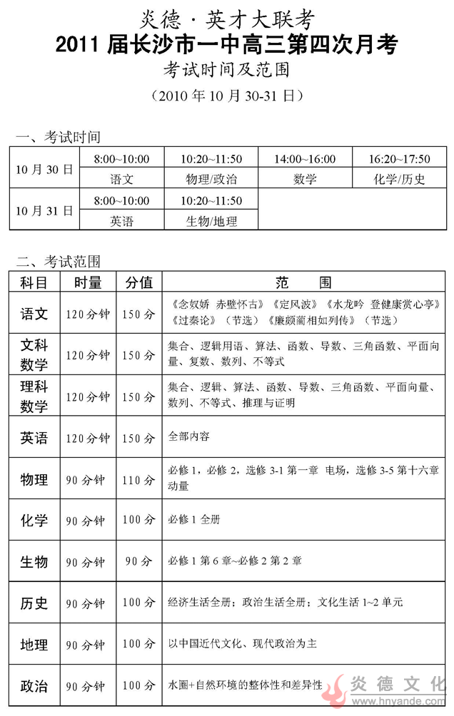 炎德英才大聯考長沙市一中2011屆高三第四次月考考試時間和范圍