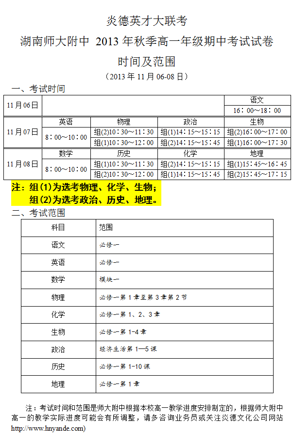2013年秋季師大附中高一年級期中考試時間及范圍(2013.10.06-08)