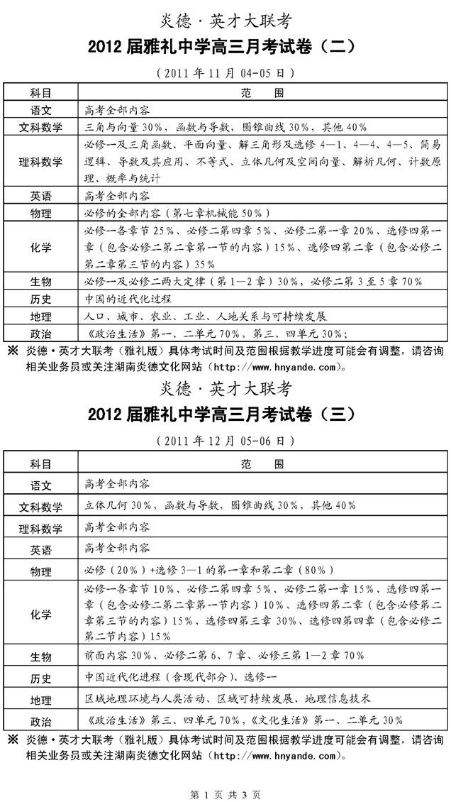 炎德英才大聯考雅禮中學2012屆高三月考試卷考試時間和范圍