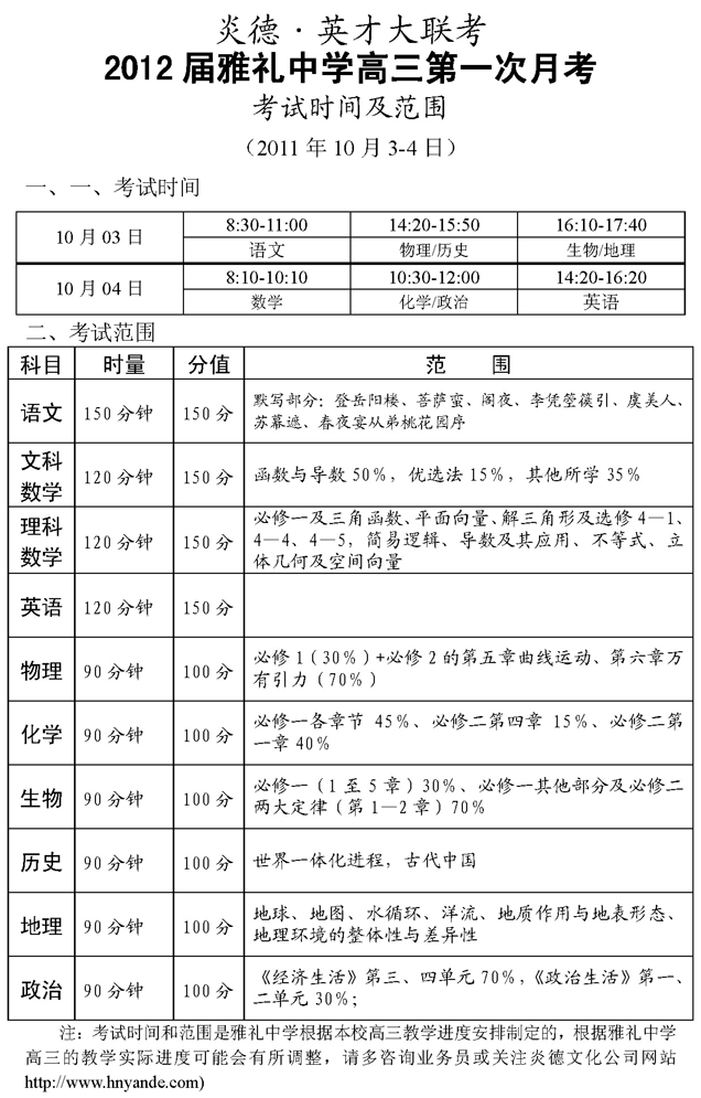 炎德英才大聯考雅禮中學2012屆高三第一次月考考試時間和范圍