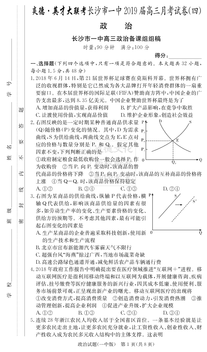 【政治】炎德英才大聯考2019長沙一中高三4次月考