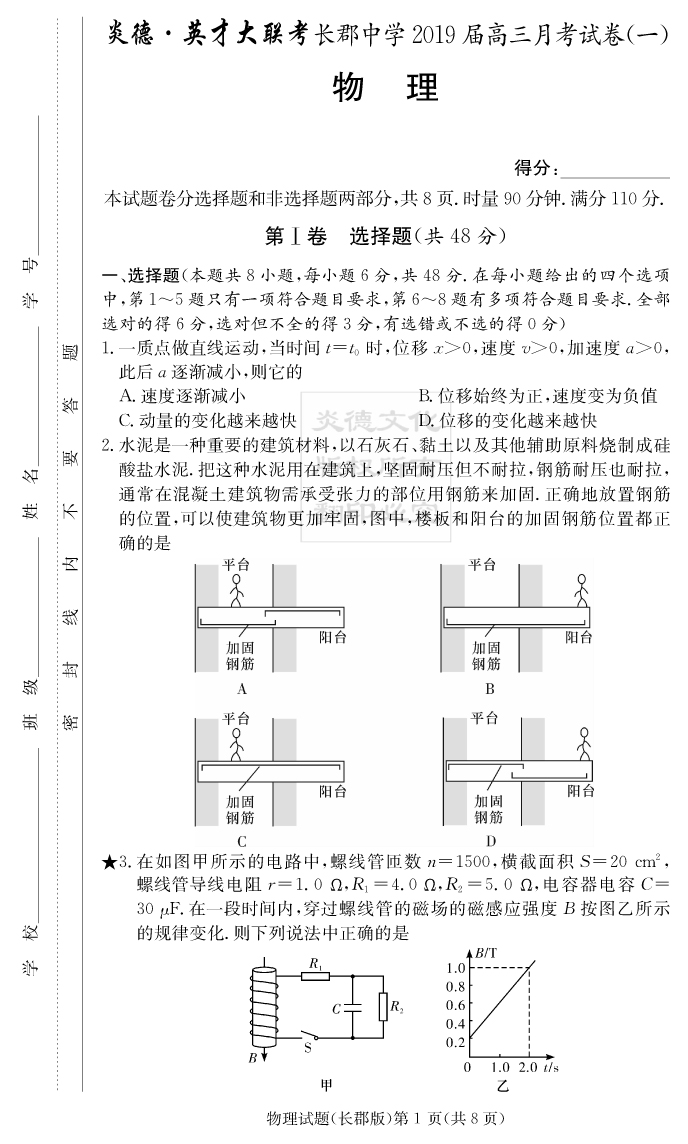 【物理】炎德英才大聯(lián)考2019長(zhǎng)郡中學(xué)高三1次月考