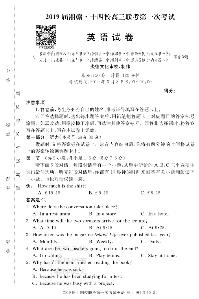 【英語】炎德英才大聯考2019長郡中學高三7次月考(十四校聯考一)