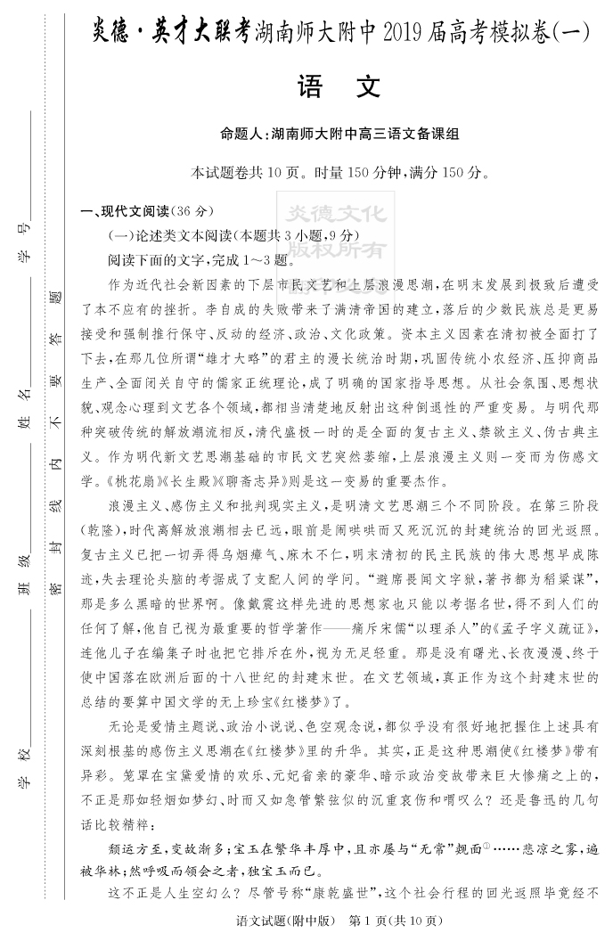 【語文】炎德英才大聯考2019師大附中高三8次月考(模擬一)