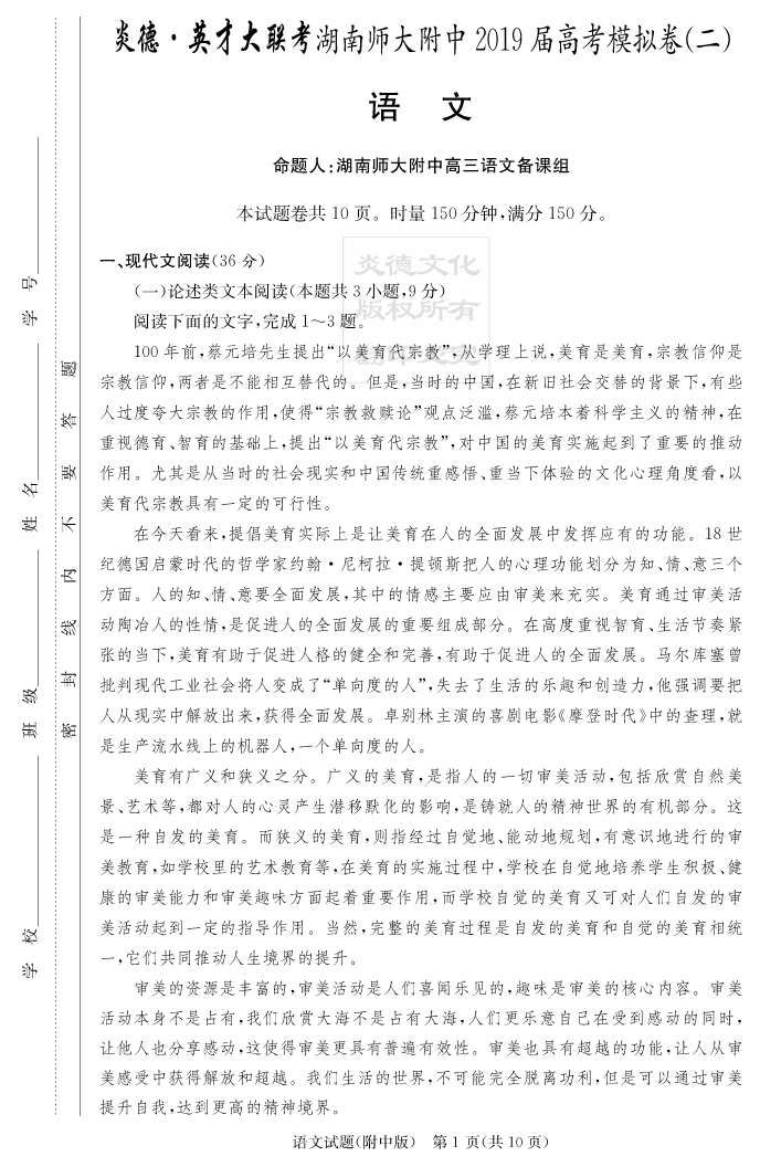 【語文】炎德英才大聯(lián)考2019師大附中高三9次月考(模擬二)