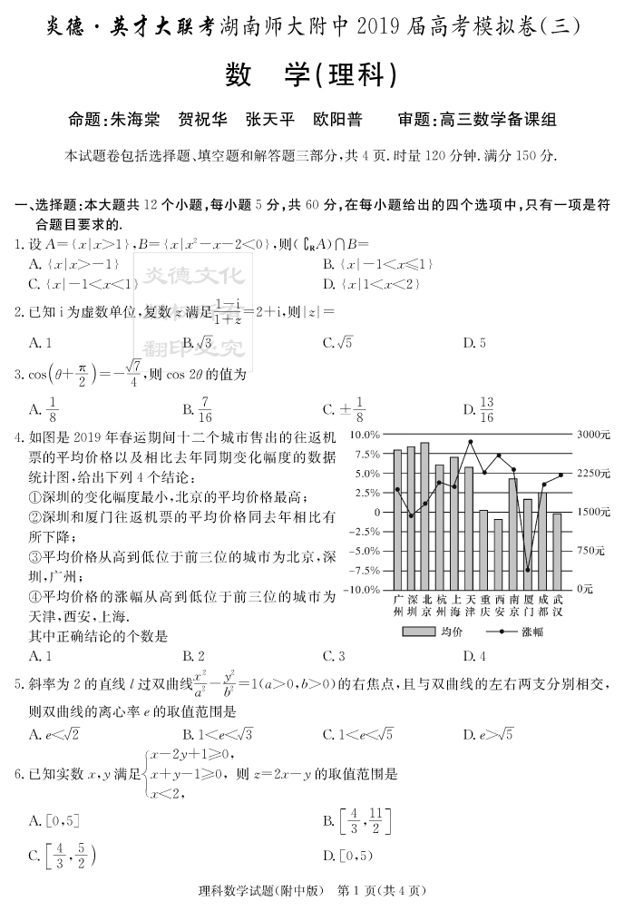 【理數(shù)】炎德英才大聯(lián)考2019師大附中高三10次月考(模擬三)