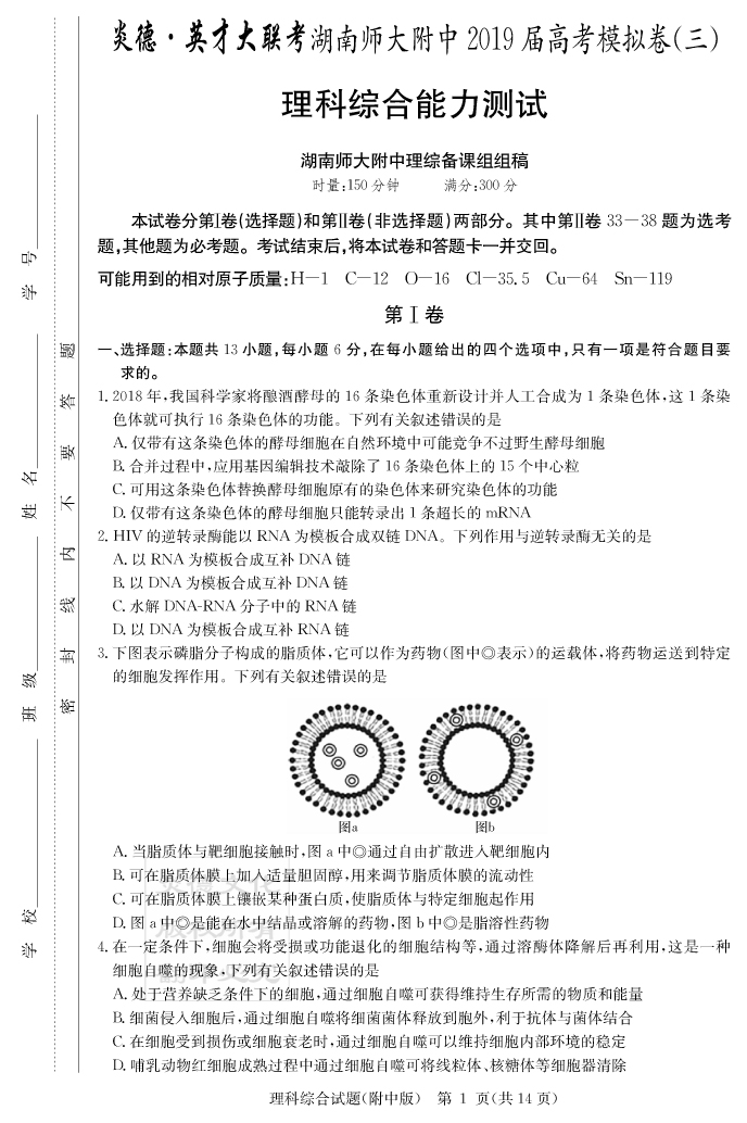 【理綜】炎德英才大聯(lián)考2019師大附中高三10次月考(模擬三)