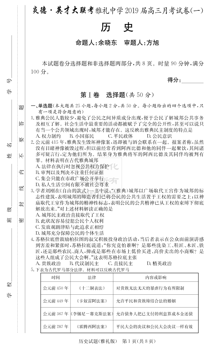 【歷史】炎德英才大聯(lián)考2019雅禮中學(xué)高三1次月考