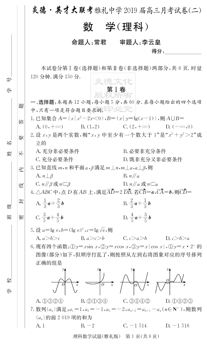 【理數(shù)】炎德英才大聯(lián)考2019雅禮中學(xué)高三2次月考
