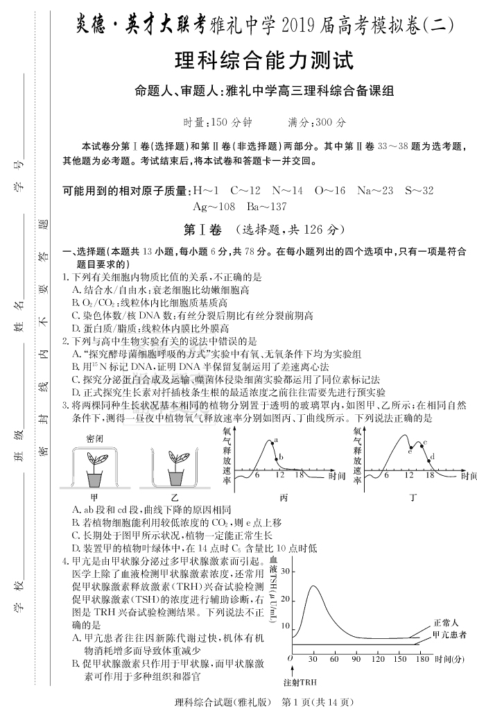 【理綜】炎德英才大聯考2019雅禮中學高三10次月考(模擬二)