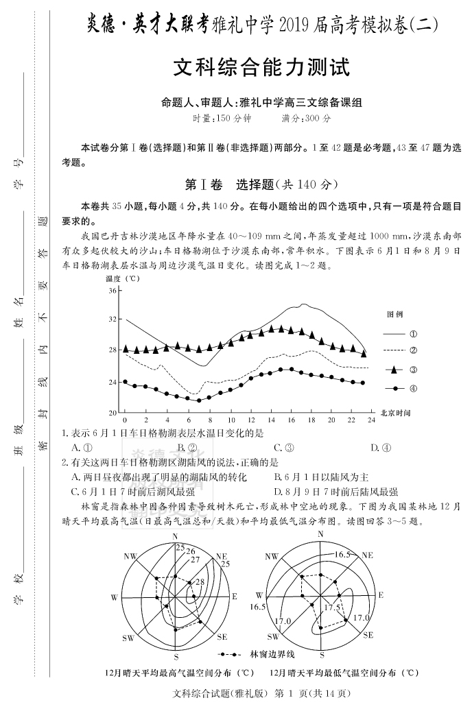 【文綜】炎德英才大聯考2019雅禮中學高三10次月考(模擬二)