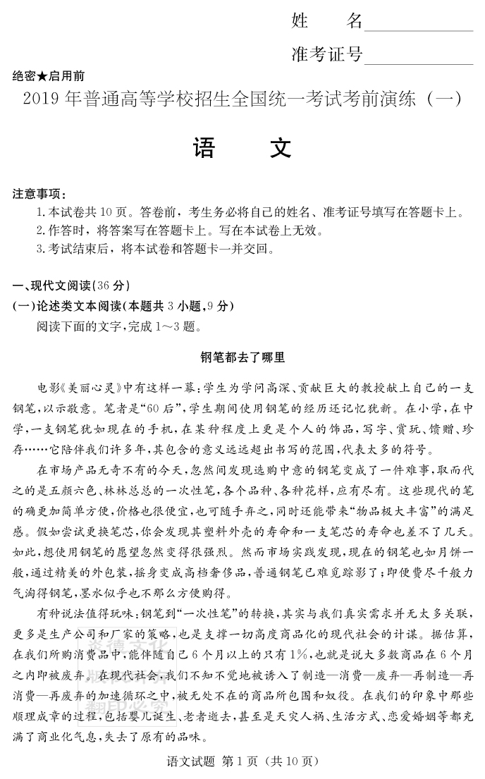 【語文】2019年普通高等學校招生全國統一考試考前演練(一)