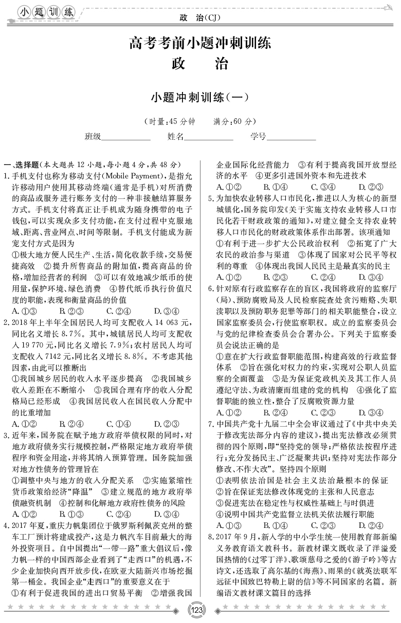2026年高中寒假作業自主學習作業本·高三年級·政治