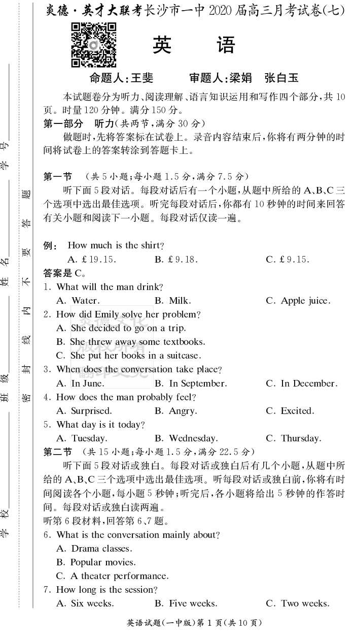 【英語】炎德英才大聯(lián)考2020屆長沙市一中高三7次月考