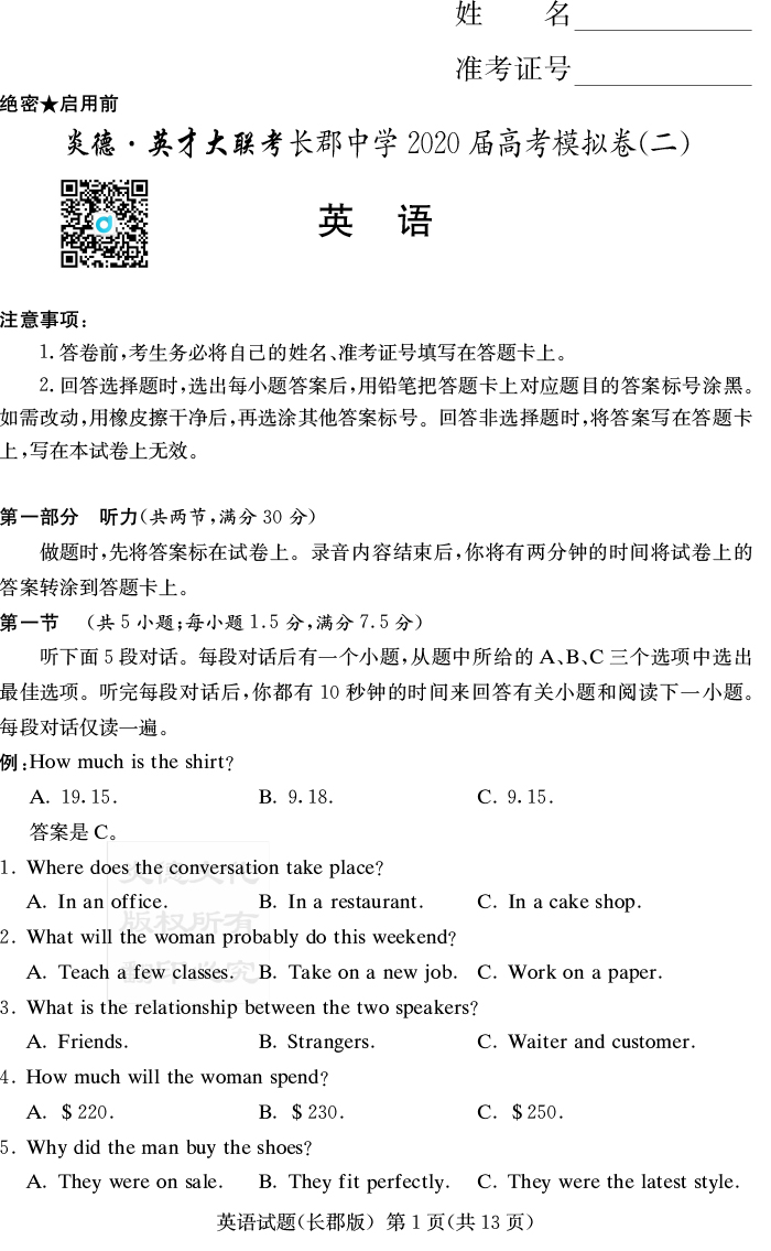 【英語】炎德英才大聯(lián)考2020屆長郡中學(xué)高三10次月考(模擬二)