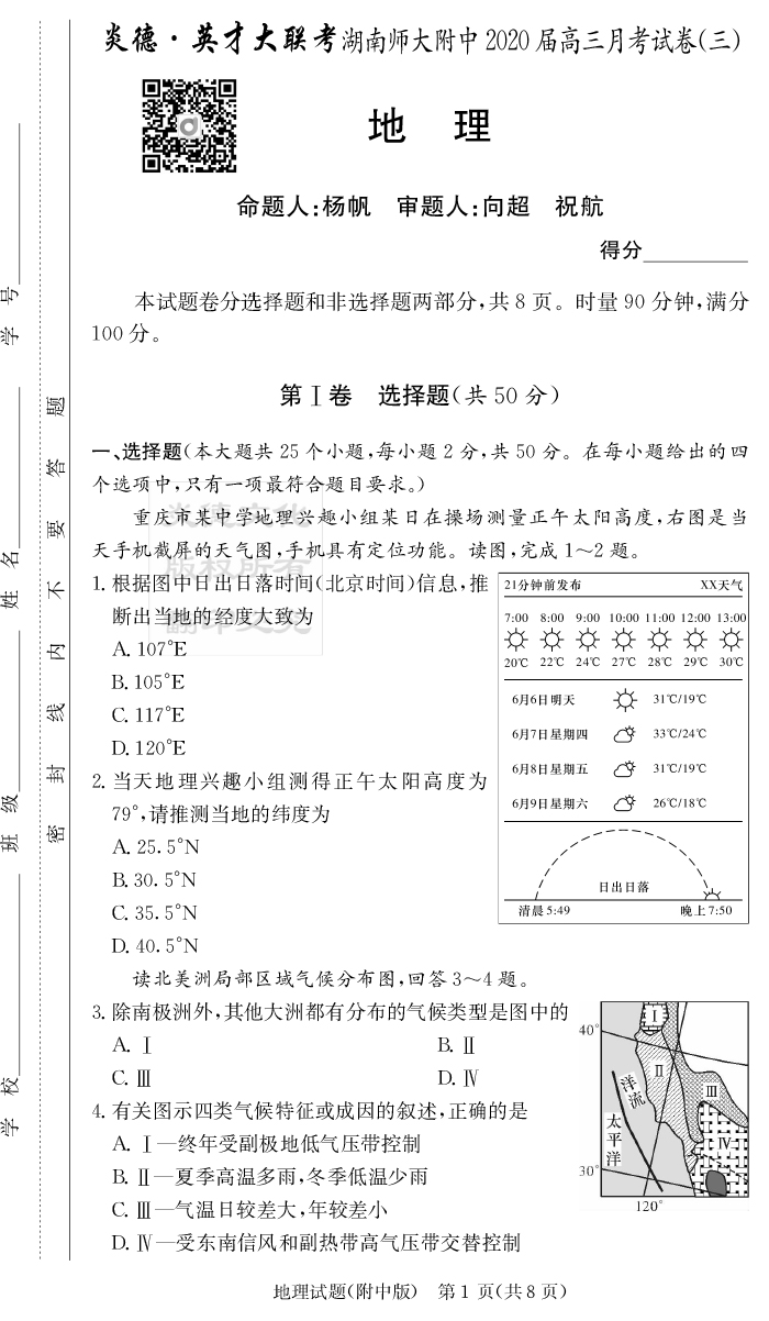 【地理】炎德英才大聯(lián)考2020屆師大附中高三3次月考