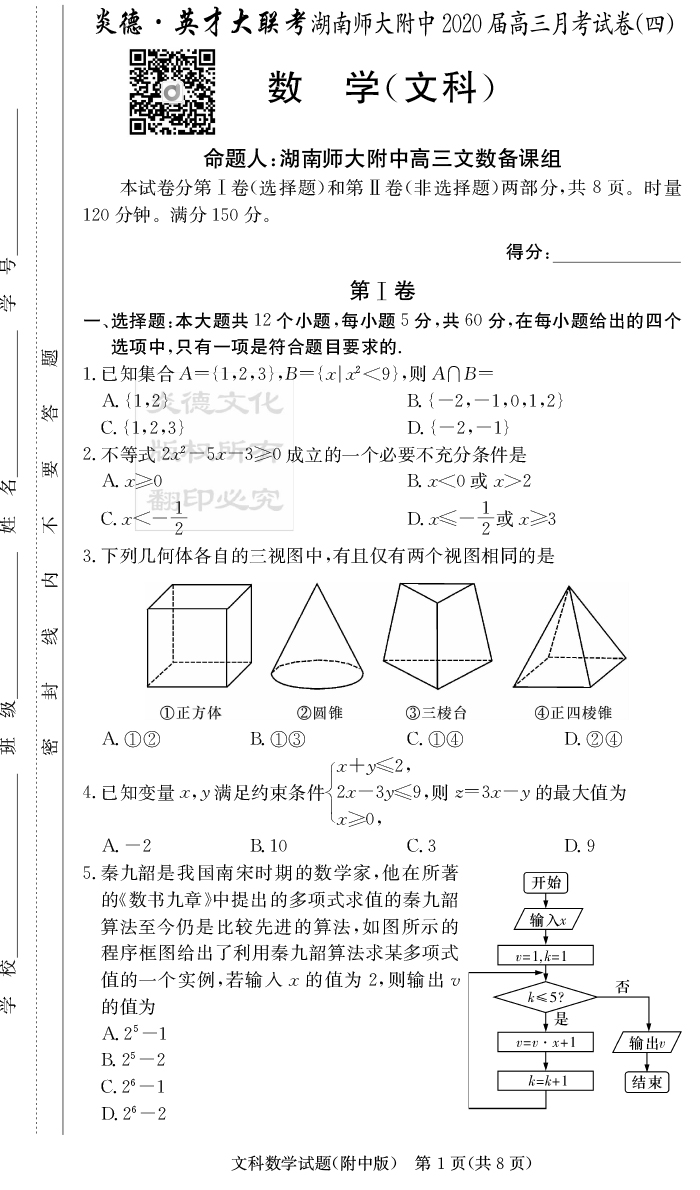 【文數(shù)】炎德英才大聯(lián)考2020屆師大附中高三4次月考