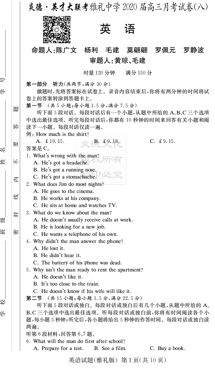 【英語(yǔ)】炎德英才大聯(lián)考2020屆雅禮中學(xué)高三8次月考