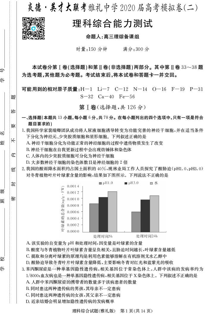 【理綜】炎德英才大聯考2020屆雅禮中學高三11次月考(模擬二)
