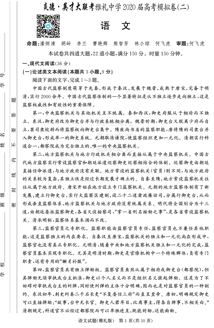 【語文】炎德英才大聯考2020屆雅禮中學高三11次月考(模擬二)