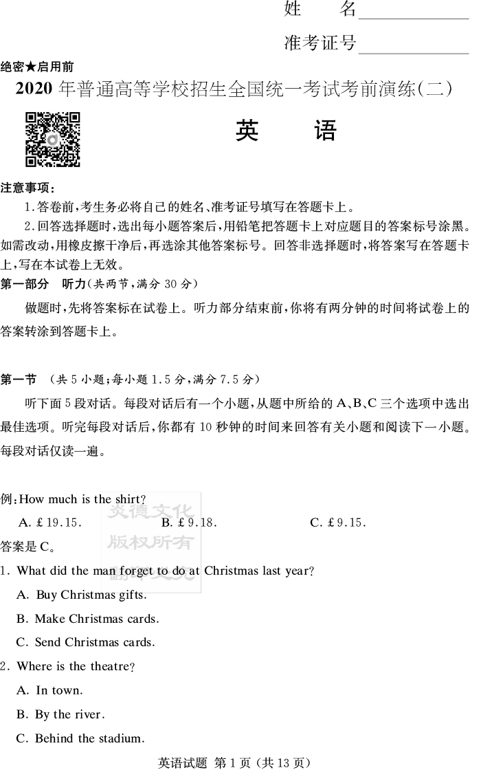 【英語】2020年普通高等學(xué)校招生全國統(tǒng)一考試考前演練(二)