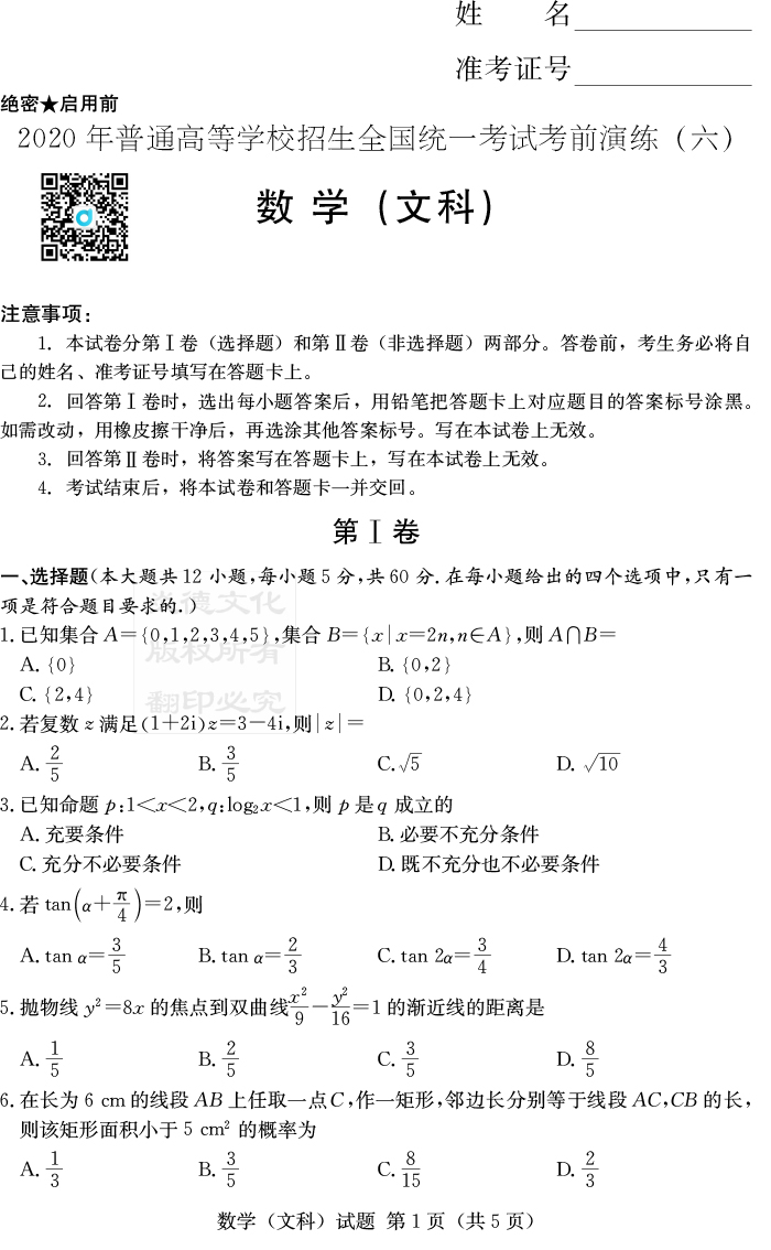 【文數(shù)】2020年普通高等學(xué)校招生全國(guó)統(tǒng)一考試考前演練(六)