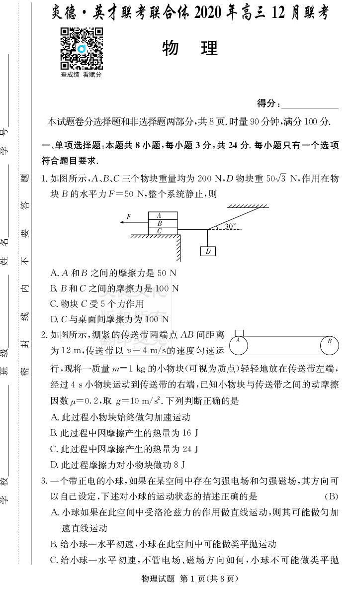 【物理】炎德英才大聯考2021屆長沙市一中高三1次月考(高三聯合體12月聯考)