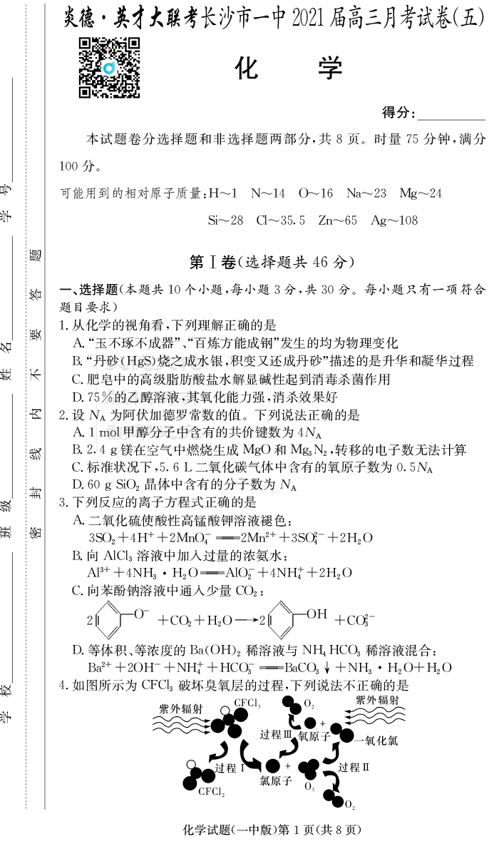 【化學】炎德英才大聯考2021屆長沙市一中高三5次月考