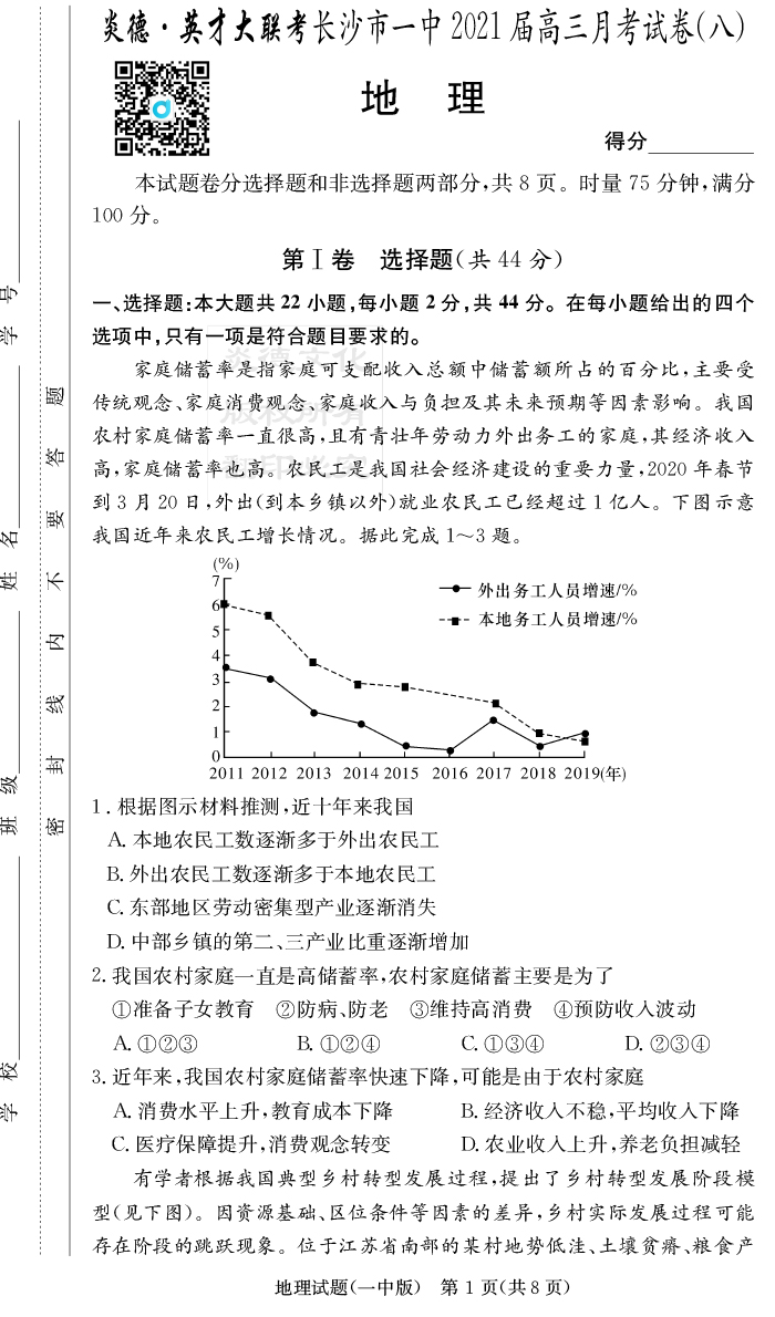 【地理】炎德英才大聯考2021屆長沙市一中高三8次月考