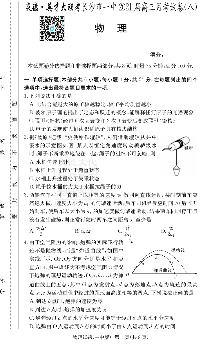 【物理】炎德英才大聯考2021屆長沙市一中高三8次月考