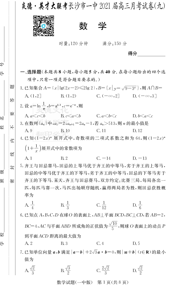 【數學】炎德英才大聯考2021屆長沙市一中高三9次月考