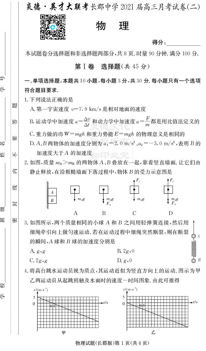 【物理】炎德英才大聯(lián)考2021屆長(zhǎng)郡中學(xué)高三2次月考