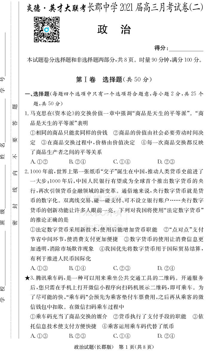 【政治】炎德英才大聯(lián)考2021屆長(zhǎng)郡中學(xué)高三2次月考