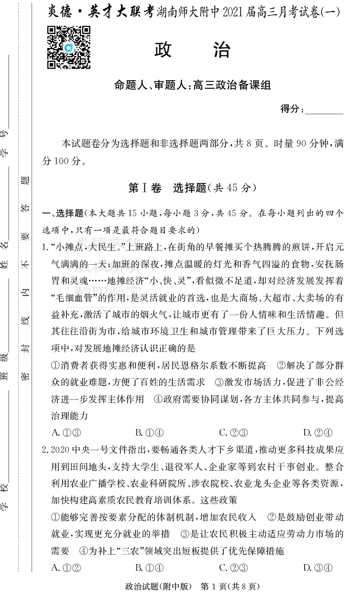 2026湖南師大附中新高考考前小題訓練·政治