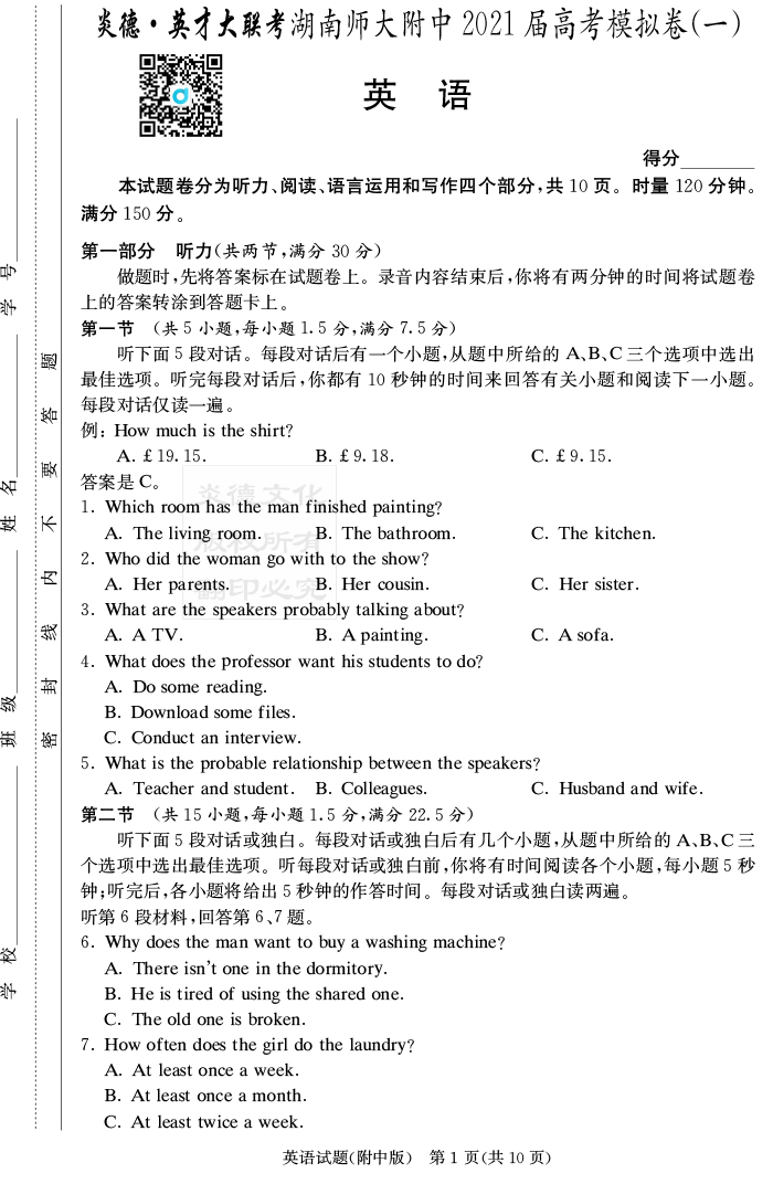 【英語】炎德英才大聯考2021屆湖南師大附中高三8次月考(模擬一)