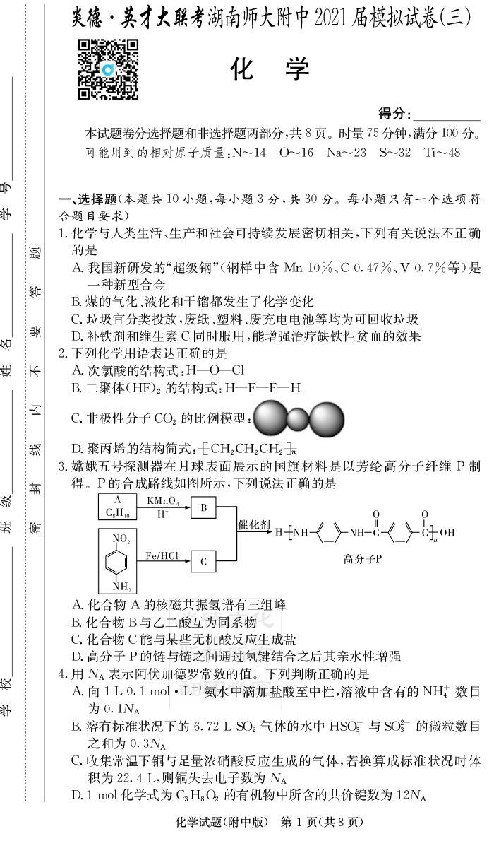 【化學】炎德英才大聯考2021屆湖南師大附中高三10次月考(模擬三)