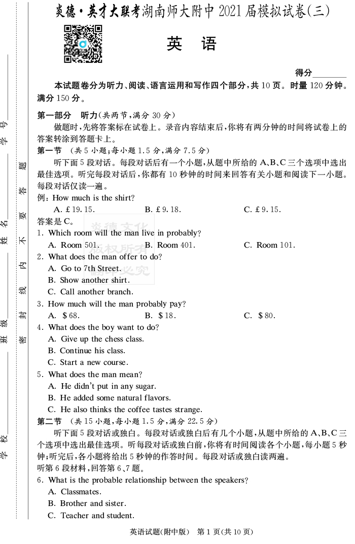 【英語】炎德英才大聯考2021屆湖南師大附中高三10次月考(模擬三)