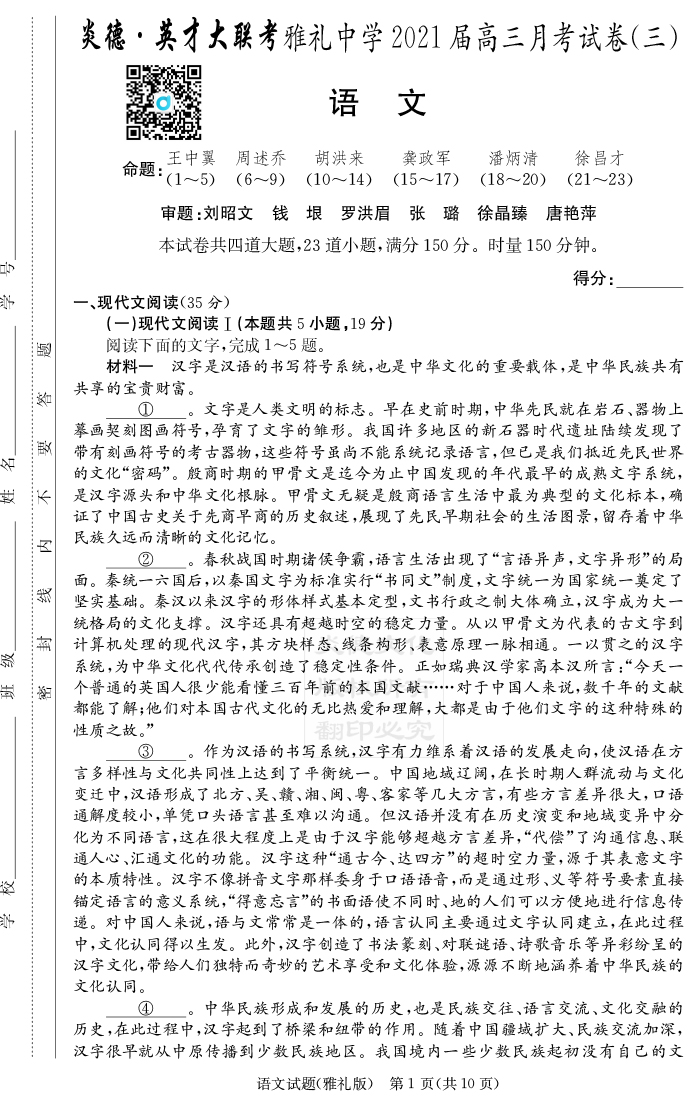 【語(yǔ)文】炎德英才大聯(lián)考2021屆雅禮中學(xué)高三3次月考