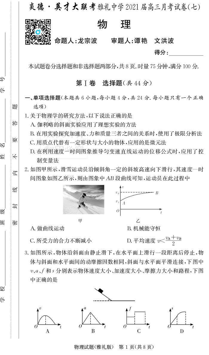 【物理】炎德英才大聯(lián)考2021屆雅禮中學(xué)高三7次月考