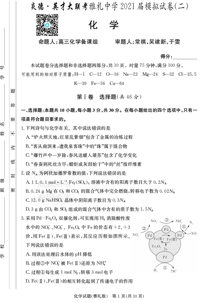 【化學(xué)】炎德英才大聯(lián)考2021屆雅禮中學(xué)高三10次月考(模擬二)