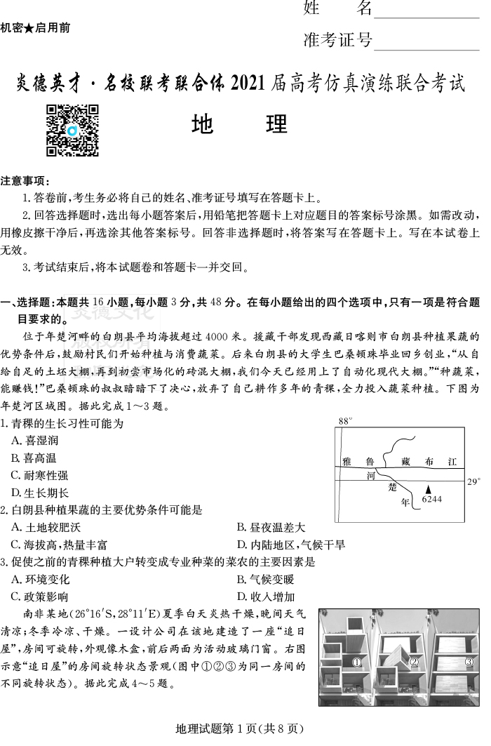 【地理】2021年普通高等學校招生全國統一考試考前演練(五)
