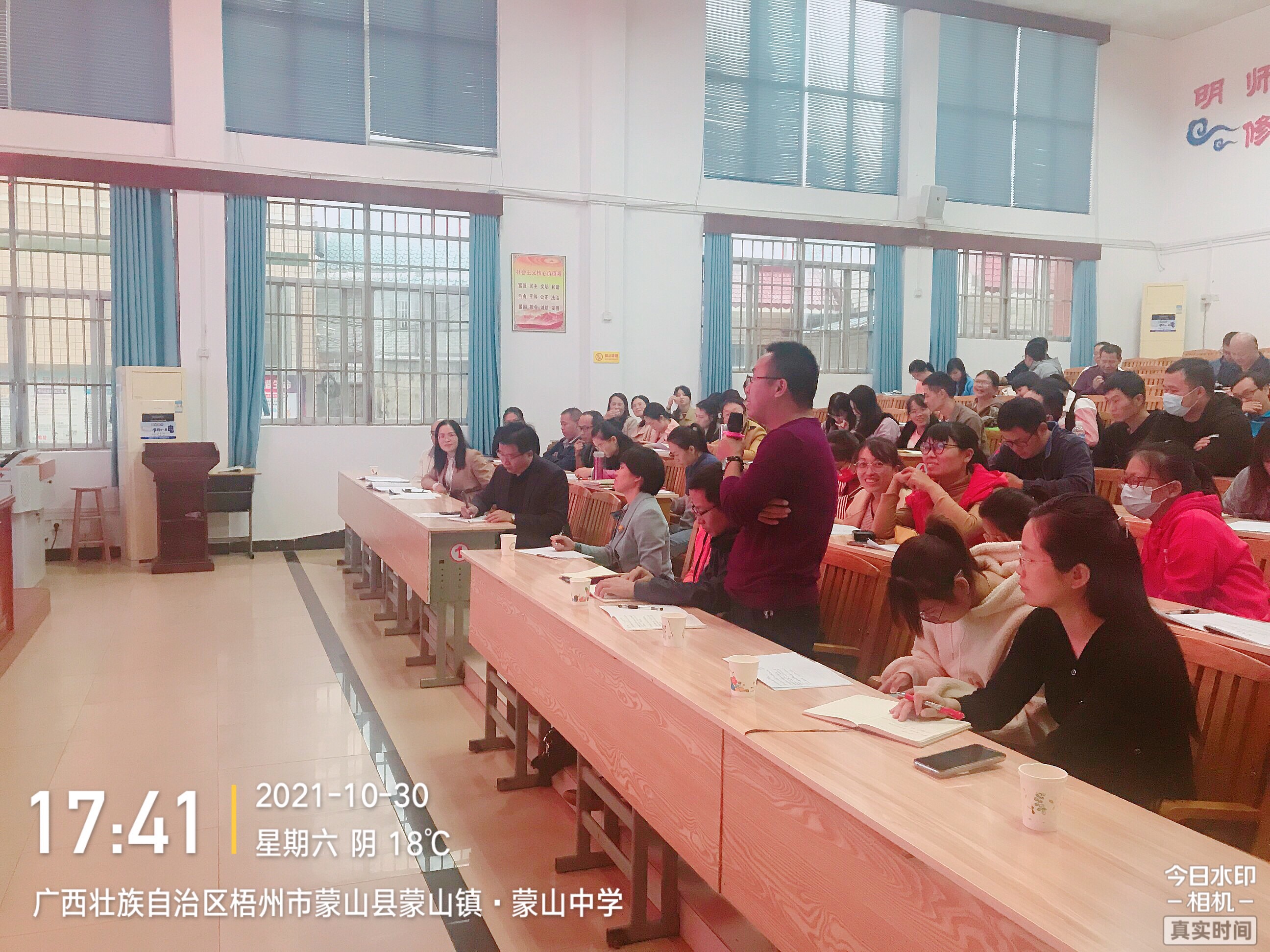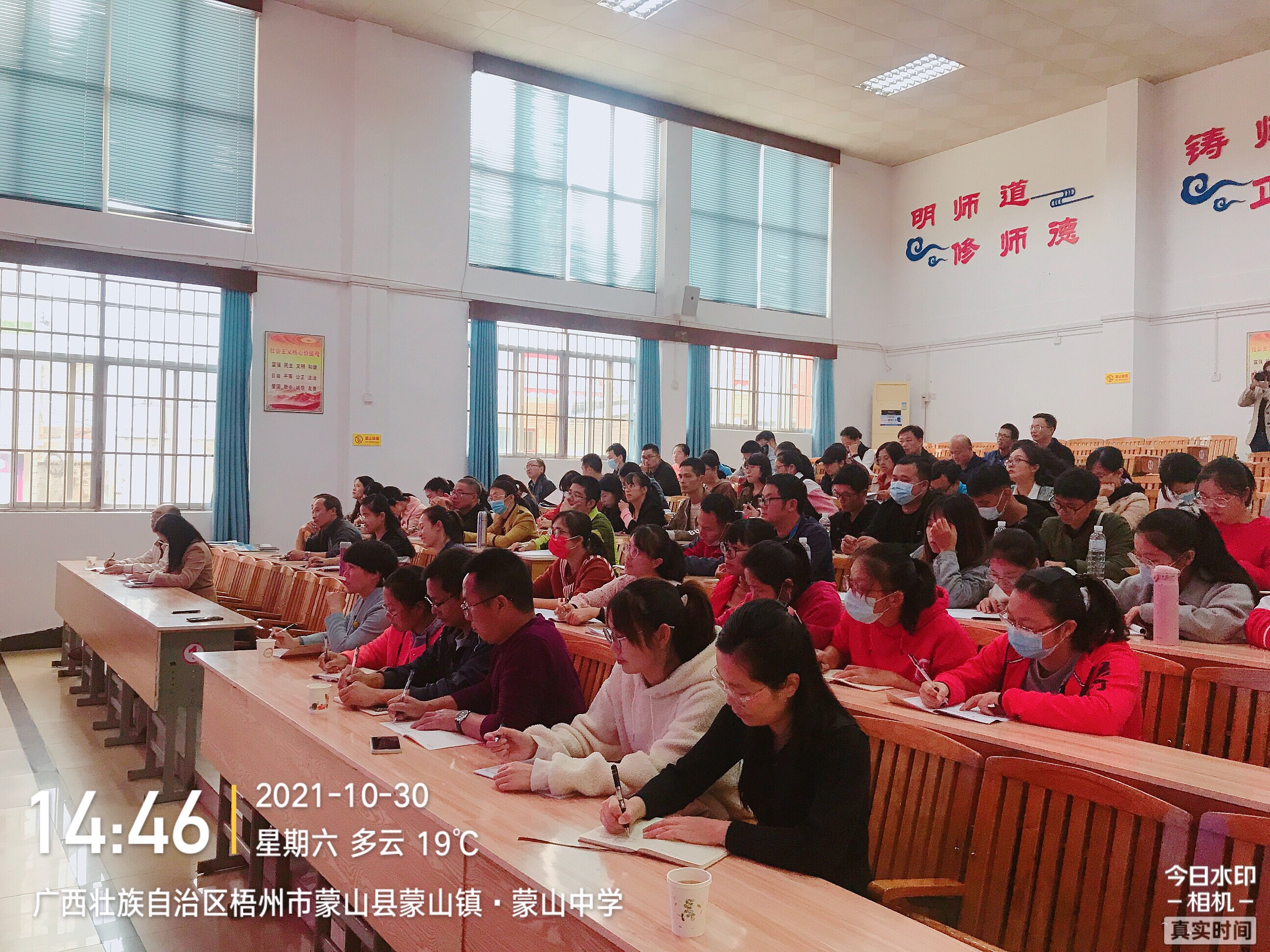 鹿寨中學全校80多名高一老師認真聽課,做筆記。