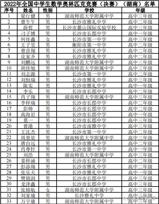 據中國數學會發布的官方公布的名單,今年湖南省進入數學奧林匹克競賽決賽的人數有33人。