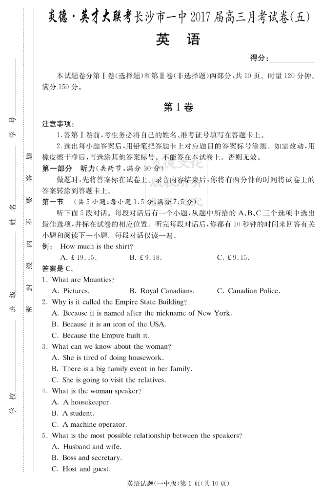 【英語】炎德英才大聯(lián)考2017長沙一中高三5次月考